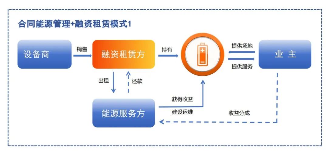 子模式1:融資租賃方根據(jù)其與能源服務(wù)方的約定從設(shè)備方處購買儲能設(shè)施,并將儲能設(shè)施出租給能源服務(wù)方。能源服務(wù)方利用租賃的儲能設(shè)施為業(yè)主提供能源服務(wù),獲得項目收益,并與業(yè)主按約定比例分成,能源服務(wù)方再以部分收益向融資租賃方進行還款。租賃期限屆滿后,能源服務(wù)方獲得儲能設(shè)施的所有權(quán)。
