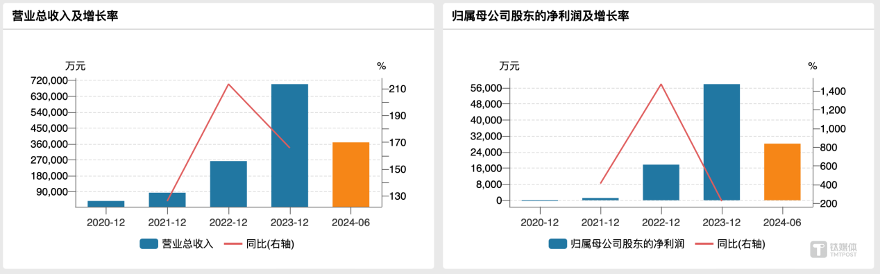 業(yè)績是最好的佐證。2021年-2023年,海博思創(chuàng)分別實(shí)現(xiàn)營收8.38億元、26.26億元、69.82億元,同比增長126.25%、213.40%、165.89%;歸母凈利潤1126.05萬元、1.77億元和5.78億元,同比增長413.46%、1474.23%和226.13%。今年上半年,公司營收、歸母凈利潤再錄得36.87億元和2.82億元。