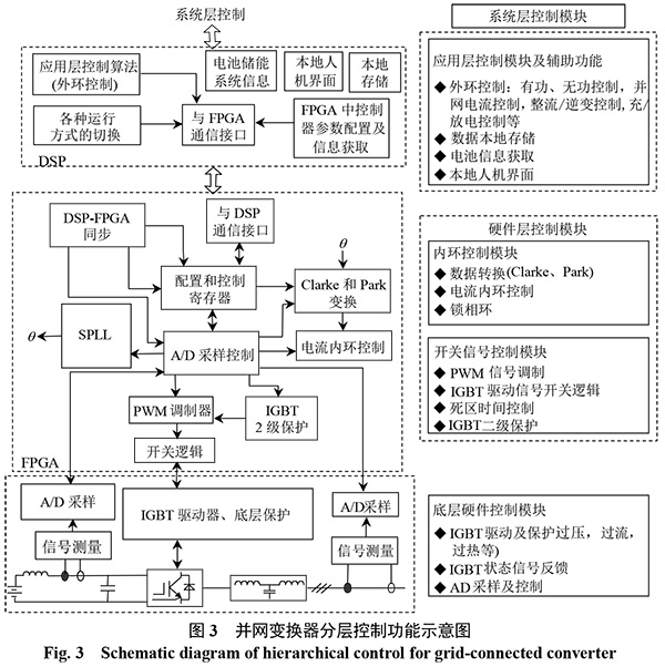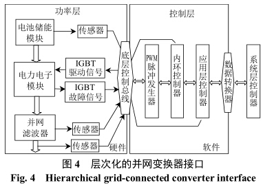 參照通信系統(tǒng)的開放系統(tǒng)互連(open system in-terconnection,OSI)模型,并網(wǎng)變換器分層控制功能示意圖如圖3所示。圖3中:θ為電網(wǎng)電壓相位;SPLL(software phase loop)為軟鎖相環(huán)[11];IGBT(insulated gate bipolar transistor)為絕緣柵雙極型晶體管。硬件層控制模塊由FPGA完成;應(yīng)用層控制模塊由DSP完成算法運(yùn)算,提高了系統(tǒng)靈活性;系統(tǒng)層控制由上位機(jī)完成,可以實(shí)現(xiàn)多個(gè)儲(chǔ)能系統(tǒng)的大規(guī)模調(diào)度。層次化的并網(wǎng)變換器接口如圖4所示。