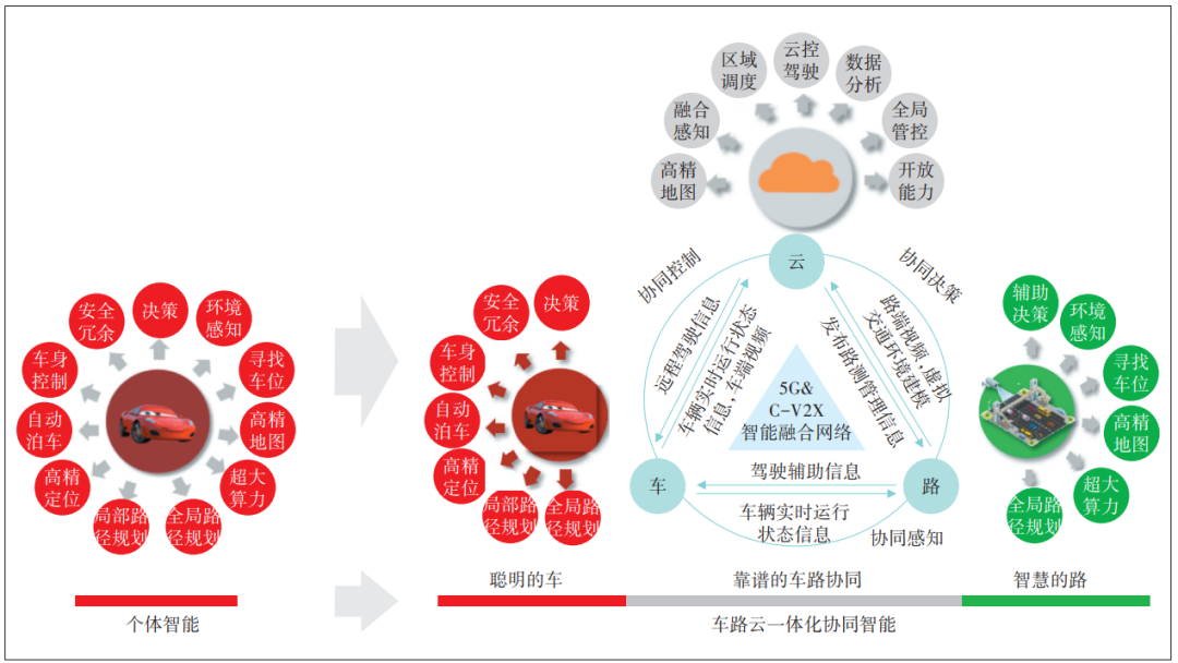 隨著車輛智能化水平的不斷提高,車載計(jì)算設(shè)備的算力逐漸難以滿足復(fù)雜路況下實(shí)時(shí)處理大量數(shù)據(jù)的需求,既是成本瓶頸,也是能力瓶頸。為解決這一問題,行業(yè)研究出車路云一體化的技術(shù)演進(jìn)路線(見圖5)。此方案體系下,車輛通過高速穩(wěn)定的通信網(wǎng)絡(luò)與云端服務(wù)器、道路感知設(shè)備進(jìn)行實(shí)時(shí)數(shù)據(jù)交互。云端強(qiáng)大的計(jì)算能力既可對車輛上傳的大量傳感器數(shù)據(jù)進(jìn)行快速處理和分析,也可處理道路感知設(shè)備上報(bào)的實(shí)時(shí)道路信息和交通狀況。平臺綜合分析后將決策指令及時(shí)反饋給車輛,從而輔助車輛做出更精準(zhǔn)的決策。車路云一體化的技術(shù)方案可有效彌補(bǔ)車輛自身算力不足,進(jìn)一步提升智能網(wǎng)聯(lián)車輛的運(yùn)行效率和安全性,并為降低智能駕駛成本推動(dòng)智能網(wǎng)聯(lián)汽車快速普及,助力智能交通發(fā)展提供堅(jiān)實(shí)基礎(chǔ)。