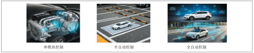 智能網(wǎng)聯(lián)汽車的技術(shù)演進(jìn)歷程一般分為3個(gè)階段(見圖4)。第1階段是單模塊控制階段,車輛各個(gè)關(guān)鍵部件如動(dòng)力系統(tǒng)、制動(dòng)系統(tǒng)等都各自配備獨(dú)立的控制模塊,模塊之間協(xié)同性較差,只能實(shí)現(xiàn)基礎(chǔ)、相對簡單的功能,例如簡單的定速巡航,車輛無法自主應(yīng)對復(fù)雜路況;第2階段是半自動(dòng)控制階段,部分駕駛?cè)蝿?wù)可以由車輛自動(dòng)完成,例如記憶泊車功能,車輛能夠自動(dòng)識別停車位并精準(zhǔn)控制轉(zhuǎn)向、速度等完成泊車動(dòng)作,但仍需要駕駛員參與;第3階段是全自動(dòng)控制階段,車輛已達(dá)成真正意義上的高度智能化與自主化。車輛依托自身及周邊環(huán)境多傳感器融合技術(shù)構(gòu)建起全方位、高精度的環(huán)境感知體系,并基于云端智能網(wǎng)聯(lián)平臺的強(qiáng)大賦能,具備強(qiáng)大的駕駛決策能力,可實(shí)時(shí)調(diào)整行駛策略以應(yīng)對復(fù)雜多變交通場景,全程無需駕駛員任何干預(yù)。