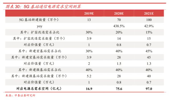 5G基站單站功耗大幅提升,將對基站配套電源傳輸容量、供電密度及供電可靠性提出巨大挑戰(zhàn)。2020-2021 年 年 5G 基站通信電源市場空間有望達(dá) 76/97 億元。2020 年1月國移動首次 5G一體化電源招標(biāo),公司份額維持第一梯隊(duì)。2020 年3月中國移動組合式開關(guān)電源招標(biāo) ,公司份額位居第一、中恒電氣中標(biāo)份額 40%,投標(biāo)價 3.62 億元超市場預(yù)期。