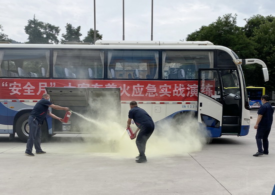 在演練時,隨著滿載乘客的大客車行駛至劉電賓館門前,突然行李艙起火,大客車駕駛員在突然遇火險緊急情況下,立即開啟應急雙閃燈,靠邊停車,打開車門,迅速引導車內(nèi)乘客有序疏散,并要求大家用濕毛巾捂住口鼻,彎腰依次撤離到車外安全地帶。緊接著滅火組演練人員迅速行動起來,熟練地取出車載滅火器,拔下滅火器安全銷,用噴口對準火源根部,及時將火撲滅,救護組及時疏散和救援下車人員,并對傷員身體狀況進行基本護理和檢查。整個演練過程既緊張,又有條不紊,進一步增強了全體員工的安全意識,真正掌握了交通工具突發(fā)火險后迅速逃生、自救、互救的基本方法,達到了演練的預期目的。