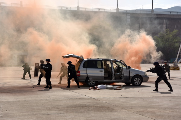 刺耳的警笛響起,縣公安局、縣消防救援大隊(duì)、醫(yī)療救援機(jī)構(gòu)車(chē)輛疾馳趕往事發(fā)地點(diǎn),3名恐怖分子與武警戰(zhàn)士、防暴警察展開(kāi)對(duì)峙。