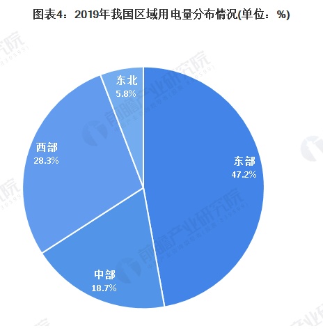 2019年,東、中、西部和東北地區(qū)全社會(huì)用電量分別比上年增長3.6%、4.5%、6.2%、3.7%,占全國比重分別為47.2%、18.7%、28.3%、5.8%