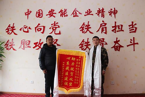 3月底,薩嘎縣達(dá)吉嶺鄉(xiāng)派出所營(yíng)區(qū)計(jì)劃進(jìn)行整體硬化,但由于當(dāng)?shù)亟ㄔO(shè)經(jīng)費(fèi)緊張,一直未能批復(fù)。何樂(lè)鋒在了解當(dāng)?shù)氐睦щy后,主動(dòng)為他們捐贈(zèng)了20噸水泥,解決了他們建設(shè)的燃眉之急,有效改善了派出所的辦公生活條件。嶺鄉(xiāng)派出所所長(zhǎng)旦增扎巴專(zhuān)程來(lái)到項(xiàng)目部,為全體人員獻(xiàn)上潔白的哈達(dá),為項(xiàng)目部贈(zèng)送了印有“心系藏區(qū)建設(shè),助力脫貧攻堅(jiān)”內(nèi)容的錦旗和感謝信,“中國(guó)安能為我們幫了大忙,建設(shè)阿里聯(lián)網(wǎng)工程為我們送電,為我們解決務(wù)工難題,還支持我們建設(shè),我受我們鄉(xiāng)書(shū)記委托,專(zhuān)程過(guò)來(lái)感謝你們,我們達(dá)吉嶺鄉(xiāng)全鄉(xiāng)人民都感謝你們!”他緊握項(xiàng)目經(jīng)理何樂(lè)峰的雙手,動(dòng)情地說(shuō)道。