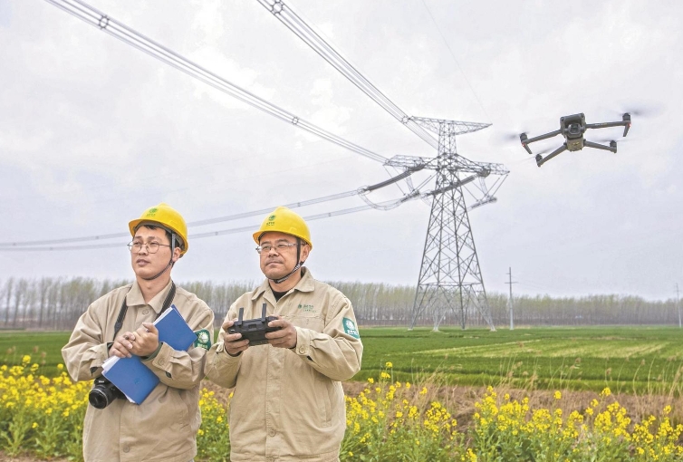 張?zhí)烀?右)帶領班組成員開展無人機巡檢。