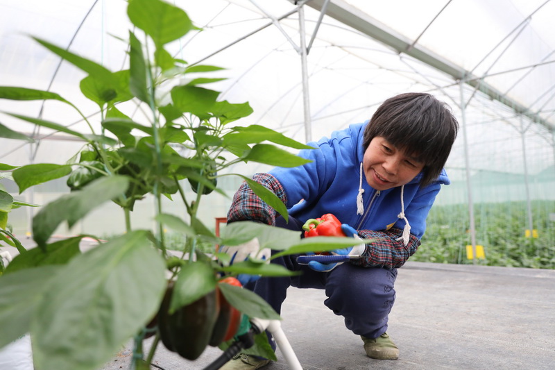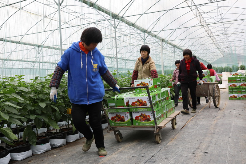 大棚種植基地迎來豐收喜悅,小婷媽媽和高鋒一起搬運(yùn)豐收的彩椒。孫嘉彪 攝