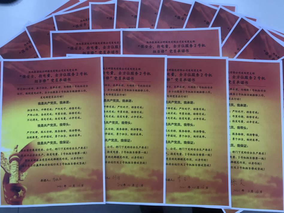 他們保證:堅(jiān)決落實(shí)集團(tuán)黨委、公司、部門下發(fā)的安全生產(chǎn)要求!堅(jiān)決沖在安全生產(chǎn)、搶發(fā)電量、2號(hào)機(jī)組B修第一線!堅(jiān)決發(fā)揮基層黨員的先鋒模范作用,以身作則!竭盡全力打贏單機(jī)安全運(yùn)行及2號(hào)機(jī)組B修攻堅(jiān)戰(zhàn)!