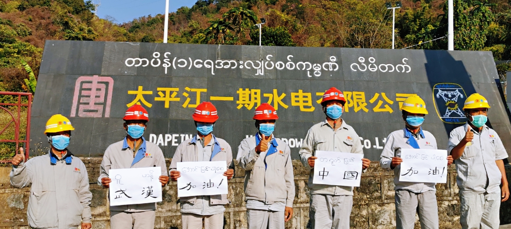 緬甸電力部派駐太平江電站的全體代表與大唐職工一起努力防疫抗疫,他們?yōu)槲錆h加油!為中國(guó)加油?。ɡ钣辣?攝)