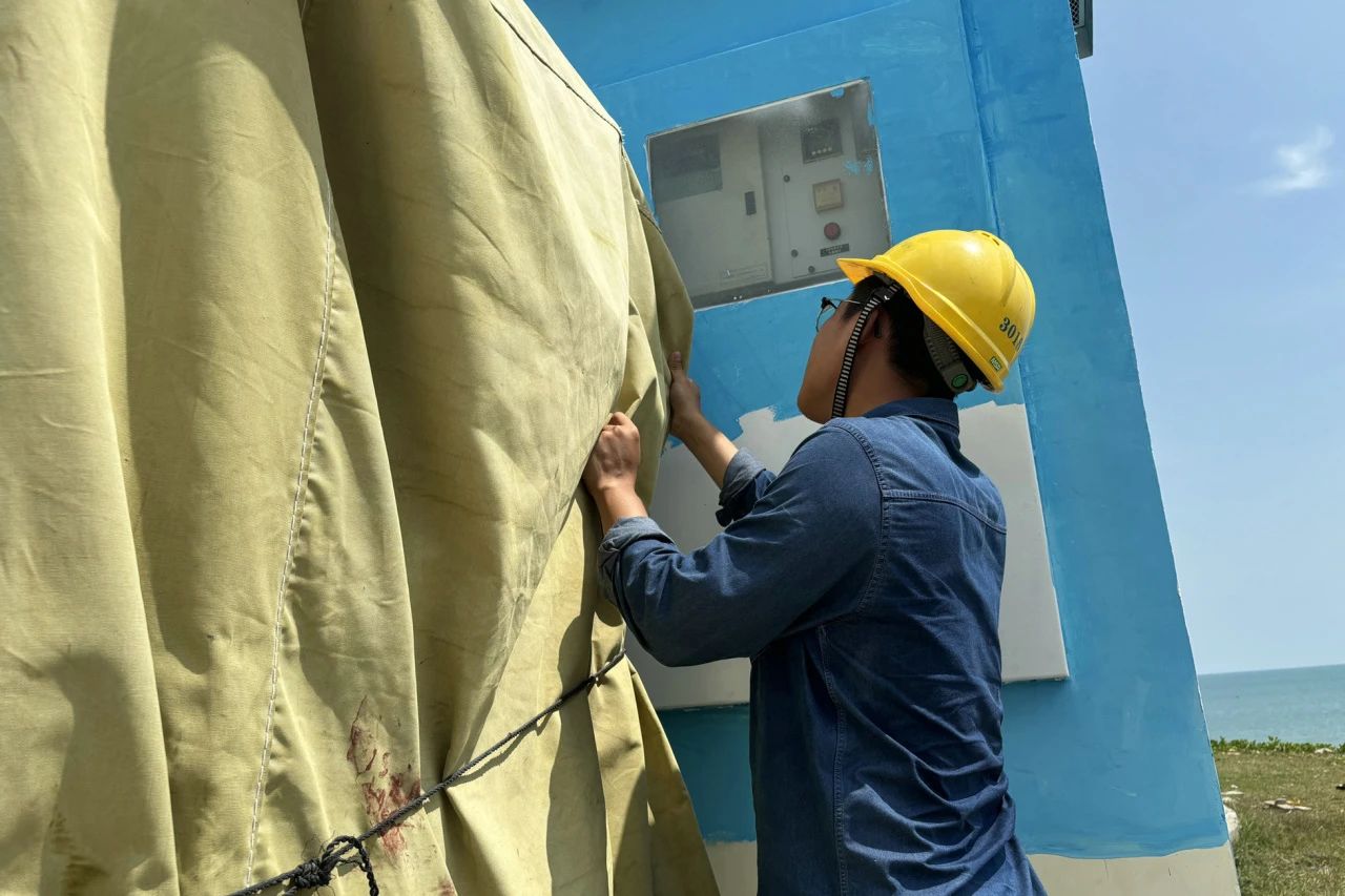 海南清能分公司加大災(zāi)害風(fēng)險研判,逐一落實在建風(fēng)電機組防臺防汛措施。臺風(fēng)登陸期間,按照調(diào)度要求,將所轄光伏項目全部解網(wǎng)退出,確保電網(wǎng)運行安全。