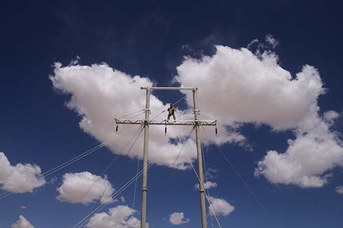 項目架空線路桿塔共計668基,12種桿塔型式。桿塔是在35kV架空線路架設,線路總長度約122.21km,塔高為15-21米,屬于高空作業(yè)。施工現(xiàn)場干旱炎熱,沙塵暴和冰雹也常常輪番“光顧”,給施工進度和安全管理帶來不小的挑戰(zhàn)。在桿塔組立作業(yè)前,項目部組織協(xié)作隊伍召開專題安全會,施工隊長徐少帥堅持對現(xiàn)場的施工操作人員進行詳細的安全、技術、質(zhì)量交底工作;質(zhì)量安全科林周彬堅持每天現(xiàn)場巡查,要求高空作業(yè)人員必須持證上崗,且具有合格的體檢報告;施工過程中,施工現(xiàn)場拉起安全警戒線、懸掛安全警示標識,安全員全程旁站監(jiān)督,確?,F(xiàn)場施工安全質(zhì)量可控。