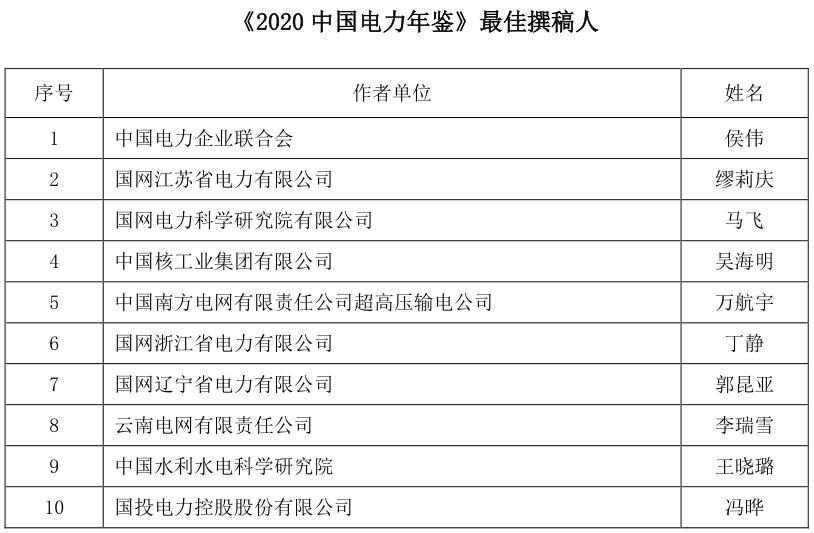 為促進(jìn)《年鑒》編撰質(zhì)量的進(jìn)一步提升,表彰在年鑒編撰工作中表現(xiàn)突出的先進(jìn)個(gè)人,根據(jù)《<中國電力年鑒>優(yōu)秀撰稿人評獎(jiǎng)辦法(試行)》,經(jīng)年鑒編輯部初評、評選委員會(huì)審核,評選出《2020中國電力年鑒》最佳撰稿人和優(yōu)秀撰稿人,現(xiàn)將名單予以公示。