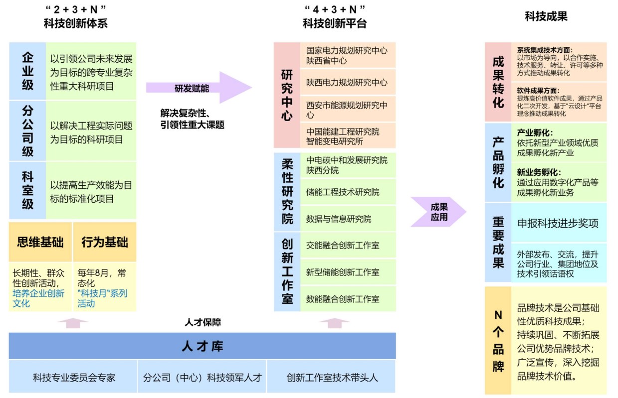 統(tǒng)籌搭建科技創(chuàng)新平臺。以“助推市場開發(fā)、加速業(yè)務轉型、孵化新型業(yè)務”為導向,聚焦關鍵核心技術攻關,整合匯聚內外部資源,搭建了“4+3+N”科技創(chuàng)新平臺,即“國家電力規(guī)劃研究中心陜西省中心”“陜西省電力規(guī)劃研究中心”“西安市能源規(guī)劃研究中心”“中國能建智能變電技術研究所”4個外部科技創(chuàng)新平臺;“中電碳中和發(fā)展研究院陜西分院”“儲能工程技術研究院”“數(shù)據(jù)與信息研究院”3個柔性組織研究院;“交能融合創(chuàng)新工作室”“新型儲能創(chuàng)新工作室”“數(shù)能融合創(chuàng)新工作室”等N個創(chuàng)新工作室。“4+3+N”科技創(chuàng)新平臺建設優(yōu)化了科技創(chuàng)新資源配置,提升了關鍵核心技術攻關能力,推動了科技成果轉化孵化,促進了陜西院科技創(chuàng)新能力快速提升。