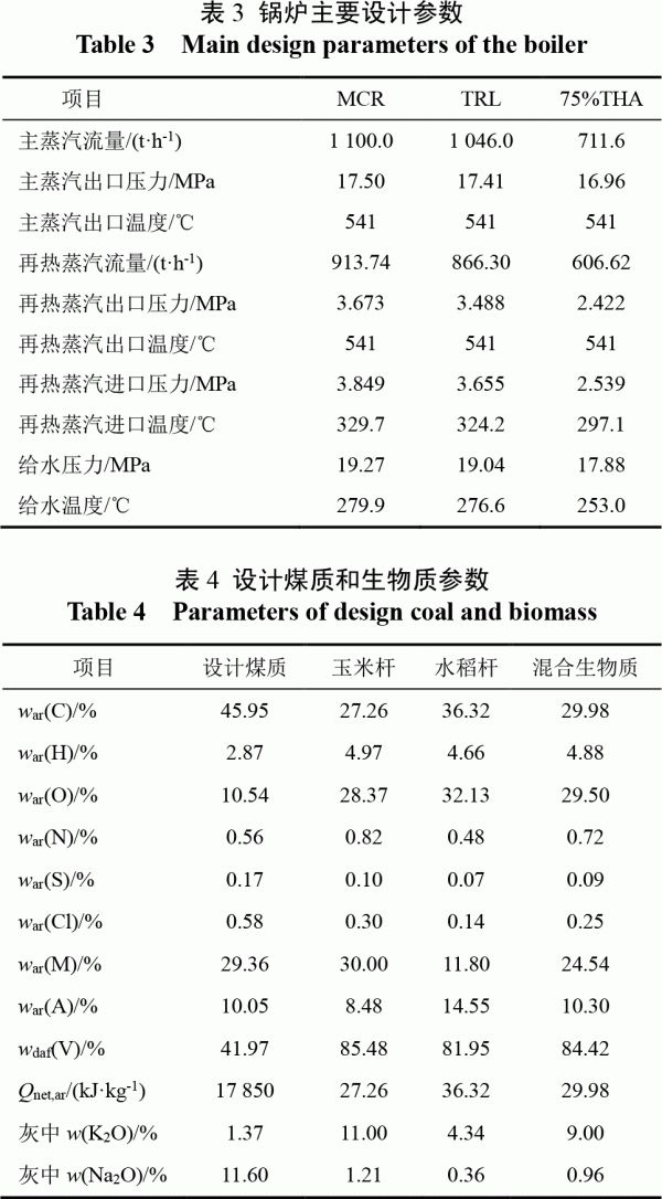 以某330MW機(jī)組建設(shè)20MW機(jī)組生物質(zhì)氣化耦合發(fā)電項(xiàng)目為例,其中1、2號(hào)機(jī)組鍋爐為亞臨界參數(shù)、一次中間再熱、自然循環(huán)汽包爐,型號(hào)為HG-1100/17.5-HM35,采用平衡通風(fēng)、四角切圓燃燒方式。鍋爐主要設(shè)計(jì)參數(shù)見(jiàn)表3,設(shè)計(jì)煤質(zhì)和生物質(zhì)參數(shù)以及生物質(zhì)氣參數(shù)分別見(jiàn)表4和表5。