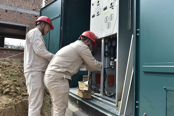 9月22日,江蘇連云港東??h供電公司施工人員在石梁河鎮(zhèn)南辰城鄉(xiāng)融合配網工程安裝500千伏安箱變。