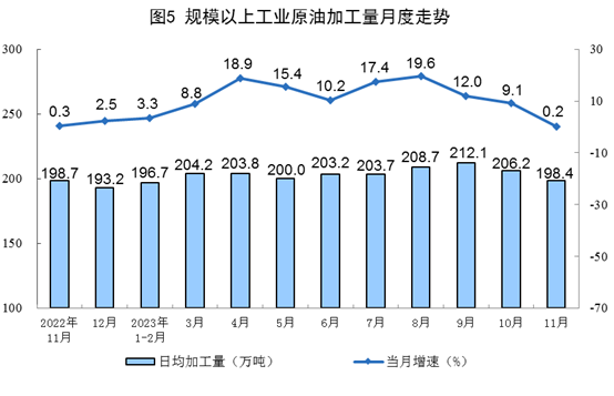 原油生產(chǎn)增速加快,進(jìn)口增速由增轉(zhuǎn)降。11月份,生產(chǎn)原油1720萬(wàn)噸,同比增長(zhǎng)2.6%,增速比10月份加快2.1個(gè)百分點(diǎn),日均產(chǎn)量57.3萬(wàn)噸。進(jìn)口原油4245萬(wàn)噸,同比下降9.2%,10月份為增長(zhǎng)13.6%。