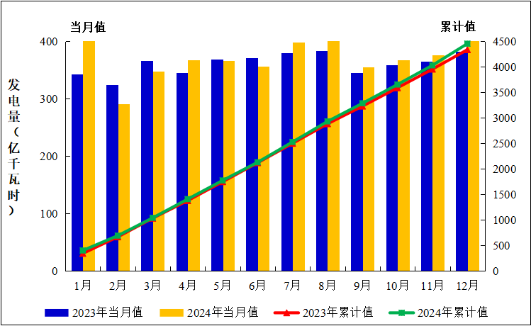 圖2:2023年1月至2024年12月全國運(yùn)行核電機(jī)組發(fā)電量趨勢