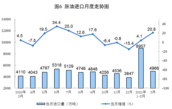 一季度,生產(chǎn)原油4918萬噸,同比增長(zhǎng)1.4%,比2019年一季度增長(zhǎng)3.8%,兩年平均增長(zhǎng)1.9%;加工原油17404萬噸,同比增長(zhǎng)16.5%,比2019年一季度增長(zhǎng)11.1%,兩年平均增長(zhǎng)5.4%。