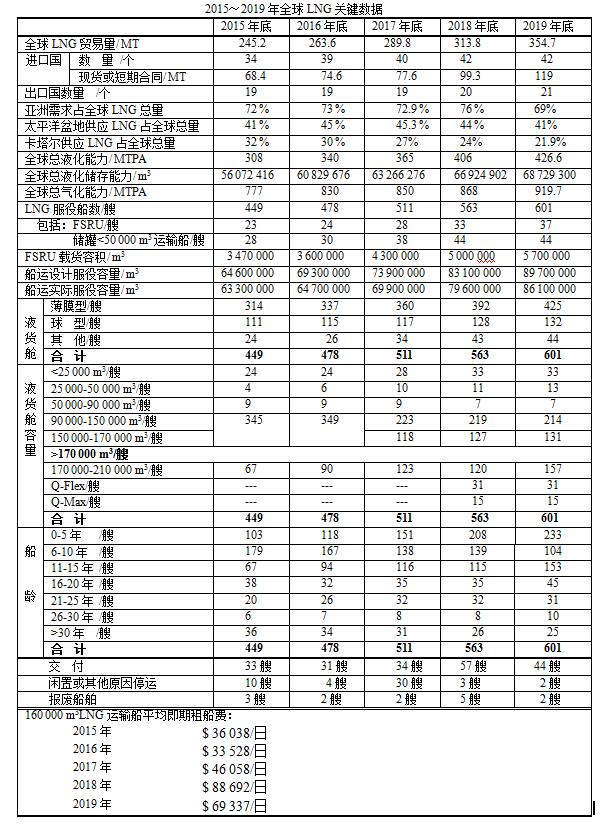 截至2019年底,有601艘運(yùn)輸船,包括37艘FSRU和44艘儲罐<50 000 m3運(yùn)輸船。