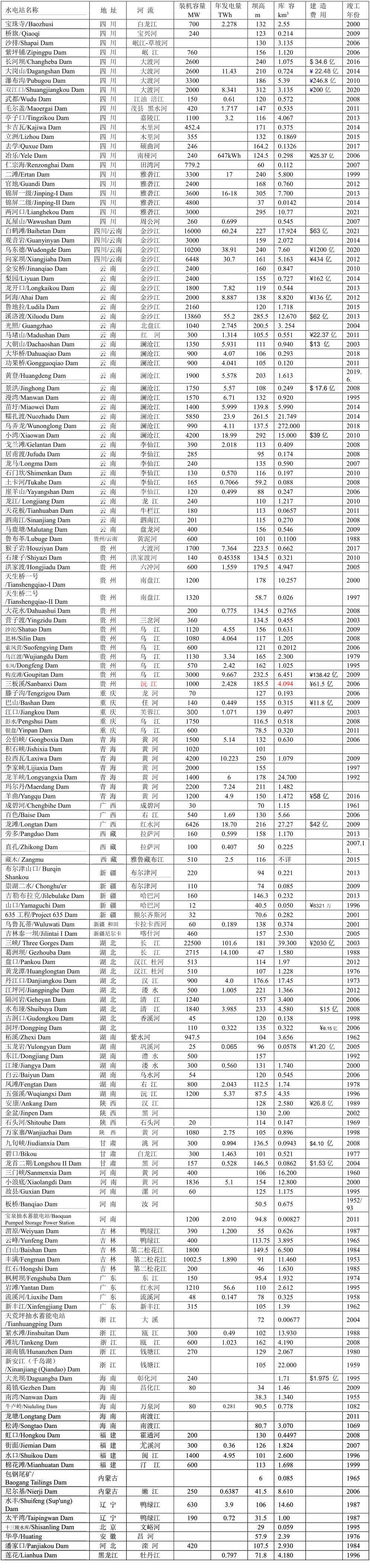 本文不可能給你提供詳細(xì)的資料,但讀者可以從本文提供的水電站名稱查閱到詳細(xì)的資料數(shù)據(jù)。但是要注意:如果從中文查閱,請?jiān)诿Q后加“水電站”,如果從英文查閱,請?jiān)诿Q后加“Dam”,如查“溪洛渡”,中文用“溪洛渡水電站”,英文用“Xiluodu Dam”。