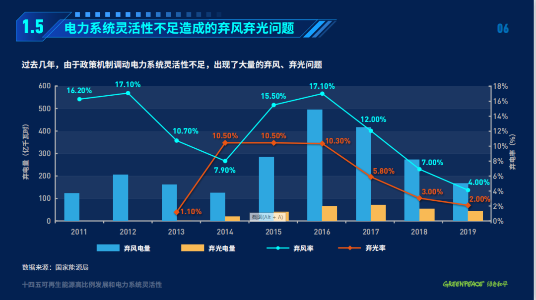 目前,中國以煤電為主的電力系統(tǒng)靈活性嚴重不足,電力系統(tǒng)的僵化導(dǎo)致了棄風(fēng)、棄光問題的出現(xiàn)。2011-2019年,中國的棄風(fēng)和棄光率一度高達17.1%和10.5%,造成了大量發(fā)電資源的浪費。2016-2018年間,中國棄風(fēng)和棄光電量共計1389億千瓦時 ,相當于約3000萬千瓦煤電廠的發(fā)電量。