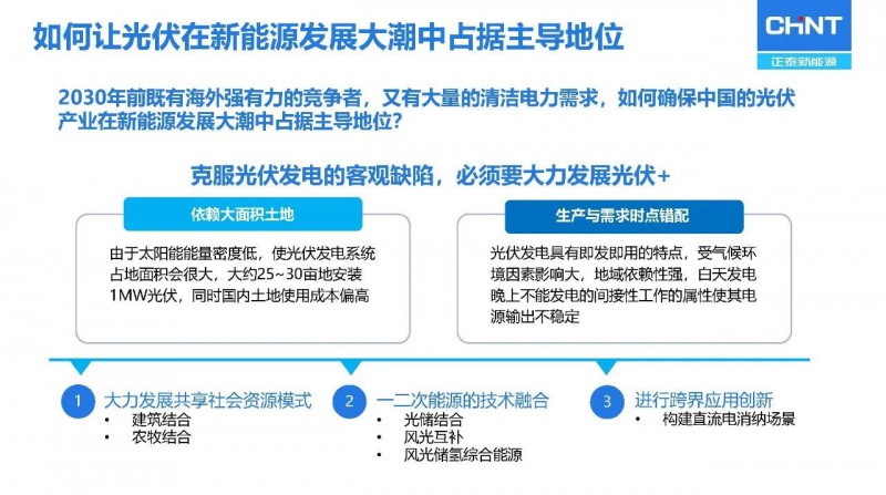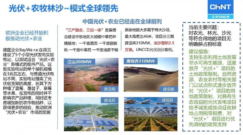 2021年2月3日,由中國光伏行業(yè)協(xié)會主辦的“光伏行業(yè)2020年發(fā)展回顧與2021年形勢展望網(wǎng)絡(luò)研討會”上,浙江正泰新能源開發(fā)有限公司總裁陸川針對我國目前光伏+融合發(fā)展模式趨勢進(jìn)行了分析。我國已經(jīng)走在了全球光伏+農(nóng)業(yè)行業(yè)的前列,針對農(nóng)光互補(bǔ)電站,他希望能夠推動自上而下的關(guān)于農(nóng)光互補(bǔ)設(shè)施正常補(bǔ)償機(jī)制的兌現(xiàn)以促進(jìn)行業(yè)更優(yōu)發(fā)展。光伏+海漁的合作方式適用于我國東南海岸,克服了東部土地緊張,不但能夠產(chǎn)生發(fā)電效益,同時還能產(chǎn)生漁業(yè)收益。光伏+儲能、光伏+風(fēng)電、光伏+制氫等均為我國光伏應(yīng)用新模式做出突出貢獻(xiàn)。戶用光伏的智能化應(yīng)用、光伏+信號基站的互補(bǔ)應(yīng)用、光伏+交通實現(xiàn)綠電出行等跨界創(chuàng)新的光伏應(yīng)用模式也將逐漸推廣,實現(xiàn)全社會層面的綠電應(yīng)用。