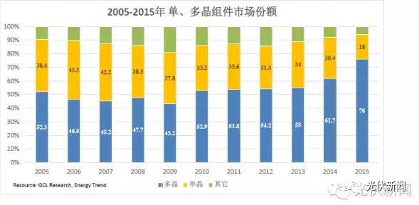 我們先來(lái)了解一些信息,圖一是05年到15年,單晶、多晶、薄膜等的市場(chǎng)份額變化,我們可以發(fā)現(xiàn),從09年到15年,單晶、薄膜等的市場(chǎng)份額是不斷降低的,而多晶則在15年實(shí)現(xiàn)了一個(gè)井噴。圖二是日本單晶市場(chǎng)份額的統(tǒng)計(jì)數(shù)據(jù),日本是一個(gè)國(guó)土面積十分有限的國(guó)家,對(duì)高效組件的需求應(yīng)該超過(guò)其他國(guó)家,可是