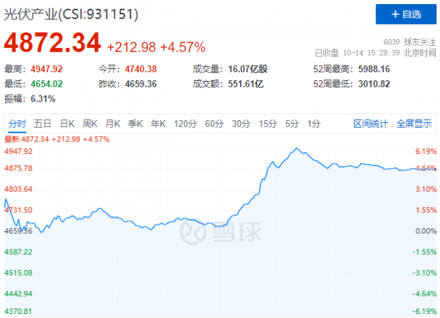 10月14日,受美國停征光伏組件“雙反”關稅利好消息影響,光伏板塊午后全線暴漲,中證光伏產(chǎn)業(yè)指數(shù)(CSI:931151)報收4872點,收漲4.57%,盤中漲幅一度達到6.18%。自10月12日低點以來的三個交易日,最高漲幅高達13%。