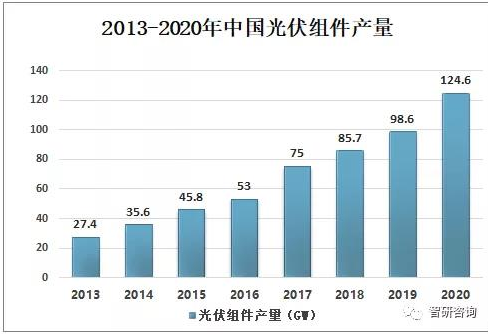 隨著中國光伏新增裝機容量不斷增加,中國光伏組件產(chǎn)量也不斷增加,2020年中國光伏組件產(chǎn)量達124.6GW,較2019年的98.6GW同比增長26.4%。