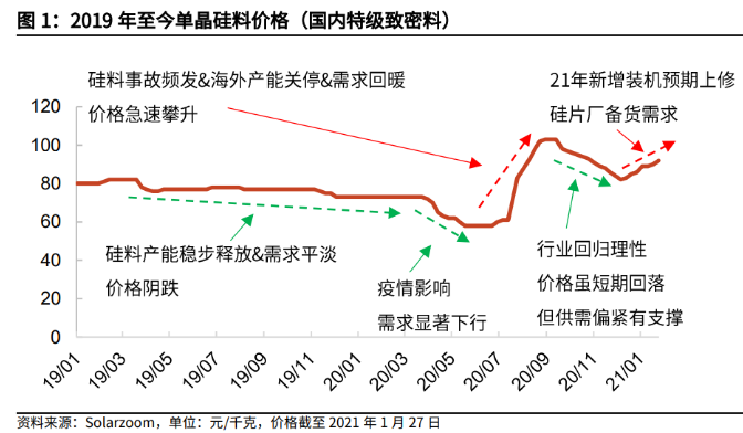 在硅料景氣度高漲的背景下,部分投資者擔心技術的更新迭代(顆粒硅技術)將給硅料生產龍頭公司未來的發(fā)展前景帶來不確定性,但是我們認為,當前硅料環(huán)節(jié)的主要矛盾是2021年供需形式緊張(供不應求)帶來的硅料供應階段性緊缺,這也將推動硅料價格維持高位,甚至在特定時間或特殊因素催化下突破100元/千克的高位,從而保障硅料龍頭企業(yè)(通威股份、新特能源、東方希望、大全新能源等)2021年的業(yè)績增長和盈利能力維持;技術更新迭代則是當前時點的次要矛盾,F(xiàn)BR顆粒硅技術的確有望成為下一代光伏的硅料技術,但是目前顆粒硅的產能、下游使用占比仍相對較低,需持續(xù)關注保利協(xié)鑫2021年6月底顆粒硅產能擴產至3萬噸后顆粒硅品質的提升、下游硅片廠商應用、以及成本的降低情況。(文章來源:光大證券)