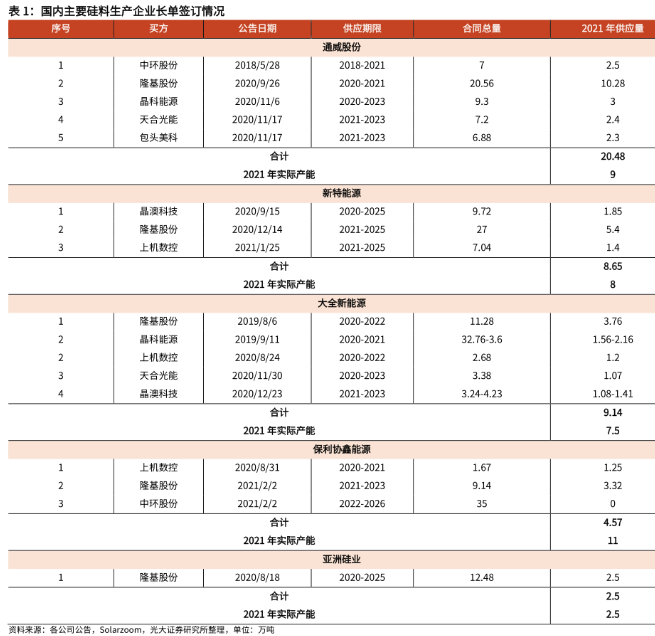 在經歷了19年的硅料產能釋放周期后,2020年我國硅料產能增量有限,且海外OCI先后關停韓國兩家多晶硅工廠(總產能從7.9萬噸滑落至3.2萬噸),2020年國內硅料在產產能從2019年的45.6萬噸小幅提升至48.4萬噸,全球硅料在產產能則從2019年底的62.2萬噸減少1.9萬噸至60.3萬噸。2021年,國內的新產能投放大多集中在Q4,因此對全年的實際產能貢獻有限,預計2021年全球的硅料供應量約為55萬噸,可滿足約170GW的硅片生產需求。與此同時,下游的硅片廠商則在高利潤留存的背景下在2019年開啟了大規(guī)模擴產浪潮。2019年在上游環(huán)節(jié)價格下跌的情況下硅片價格依然堅挺,單晶硅片環(huán)節(jié)相較其他供應鏈環(huán)節(jié)仍存在較高的利潤空間,因此各硅片企業(yè)均開啟了較為激進的擴張計劃,全國單晶硅片總名義產能從2019年的120GW擴張至2020年的217GW。展望2021年,各大硅片龍頭及二、三線硅片企業(yè)仍維持了較大規(guī)模的產能擴張節(jié)奏,2021年底的單晶硅片名義產能有望再創(chuàng)新高突破300GW。在2021年硅料實際貢獻有限、而硅片產能大幅擴張的背景下,硅片廠商于2020Q3開始密集通過和上游硅料企業(yè)簽訂鎖量不鎖價的硅料供貨長協(xié)鎖定硅料供應,從而滿足自身的生產需求。根據(jù)我們的統(tǒng)計,2021年已有超過80%的硅料產能被長協(xié)合同鎖定,主流硅料生產廠商中僅有保利協(xié)鑫的部分硅料產能尚未簽訂長協(xié)合同。