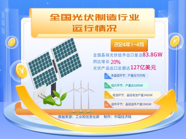 工業(yè)和信息化部12日發(fā)布2024年1-4月全國(guó)光伏制造行業(yè)運(yùn)行情況。數(shù)據(jù)顯示,1-4月,我國(guó)光伏產(chǎn)業(yè)總體保持高位運(yùn)行。