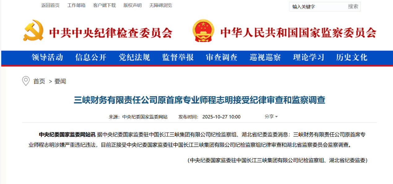 10月27日,中央紀(jì)委國(guó)家監(jiān)委網(wǎng)站信息顯示,據(jù)中央紀(jì)委國(guó)家監(jiān)委駐中國(guó)長(zhǎng)江三峽集團(tuán)有限公司紀(jì)檢監(jiān)察組、湖北省紀(jì)委監(jiān)委消息:三峽財(cái)務(wù)有限責(zé)任公司原首席專業(yè)師程志明涉嫌嚴(yán)重違紀(jì)違法,目前正接受中央紀(jì)委國(guó)家監(jiān)委駐中國(guó)長(zhǎng)江三峽集團(tuán)有限公司紀(jì)檢監(jiān)察組紀(jì)律審查和湖北省監(jiān)察委員會(huì)監(jiān)察調(diào)查。