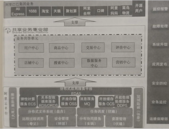 業(yè)務(wù)中臺最早是阿里集團(tuán)提出,是從淘寶、天貓系統(tǒng)中將共性的商品管理、交易管理、店鋪管理、評價(jià)管理等業(yè)務(wù)能力抽象形成業(yè)務(wù)中臺,如圖所示: