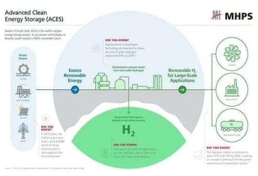 MHPS還通過猶他州高級清潔能源存儲(ACES)項目,開發(fā)了網(wǎng)格化大規(guī)模的可再生氫生產(chǎn)和存儲技術(shù)。ACES項目使用可再生能源通過電解生產(chǎn)氫氣。氫氣將在現(xiàn)場的地下鹽穴實現(xiàn)跨季節(jié)存儲,并供給墨西哥灣沿岸的煉油廠。當(dāng)風(fēng)、光可再生能源發(fā)電受限時,存儲的可再生氫可以直接發(fā)電。