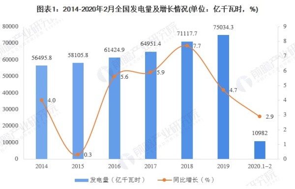 2020年1-2月,全國(guó)發(fā)電總量為10982億千瓦時(shí),同比增長(zhǎng)2.9%,增速比2019年同期下滑8.1個(gè)百分點(diǎn)。