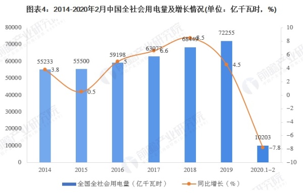 2018年全社會(huì)用電量達(dá)6.84萬億千瓦時(shí),2019年全社會(huì)用電量達(dá)7.23萬億千瓦時(shí),比上年增長(zhǎng)4.5%。2020年1-2月,受新冠影響,全社會(huì)用電量累計(jì)10203億千瓦時(shí),同比下降7.8%。分產(chǎn)業(yè)看,第一產(chǎn)業(yè)用電量114億千瓦時(shí),同比增長(zhǎng)3.9%;第二產(chǎn)業(yè)用電量6221億千瓦時(shí),同比下降12%;第三產(chǎn)業(yè)用電量1928億千瓦時(shí),同比下降3.1%;城鄉(xiāng)居民生活用電量1940億千瓦時(shí),同比增長(zhǎng)2.4%。