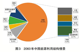 決定碳排放的第二個因素是能源清潔水平,而能源清潔水平是由非化石能源發(fā)展決定的。非化石能源(水、核、風、光等)主要以電能形式被利用,到2060年將作為主要的能源品種用于社會生產(chǎn)生活,預計將占能源消費總量的80%以上(見圖4),客觀上決定了未來以清潔電力為中心的高電氣化能源利用格局,同時也表明電力系統(tǒng)深度脫碳對碳中和目標的重要作用。而非完全電氣化部門,例如少數(shù)工業(yè)過程(采礦、鋼鐵、水泥、化工等部分生產(chǎn)環(huán)節(jié))、交通部門(長距離貨運、遠洋航運和航空等),盡管生產(chǎn)能耗顯著降低,但部分生產(chǎn)環(huán)節(jié)仍需一定量的化石能源,難以實現(xiàn)完全脫碳,意味著仍會有一定數(shù)量的與能源相關的二氧化碳排放。這部分二氧化碳需要由碳匯來中和。碳匯主要包括自然碳匯(自然生態(tài)系統(tǒng)固碳)和技術碳匯(碳捕獲與儲存技術,CCS)。2016年我國森林碳匯達到每年5-6億噸水平;有研究顯示,2010-2016年中國陸地生態(tài)系統(tǒng)碳匯年均11.1±3.8億噸,未來自然碳匯會小幅增加但很難實現(xiàn)翻倍增長。預計2060年我國能源相關碳排放降至14億噸,若加上非能源類碳排放,無法完全依靠自然碳匯實現(xiàn)碳中和,還需發(fā)展技術碳匯。