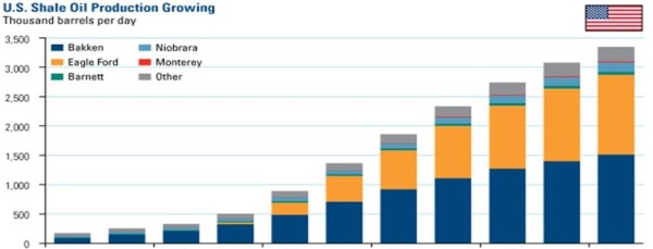 頁巖氣革命運用的水平井分段壓裂技術(shù)又引發(fā)了頁巖油革命,頁巖油成為美國原油新增產(chǎn)量的核心構(gòu)成,從而助推美國原油產(chǎn)量節(jié)節(jié)攀升。