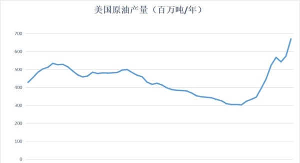 2018年美國原油產(chǎn)量達(dá)到6.7億噸,而2008年美國原油產(chǎn)量為3.0億噸。
