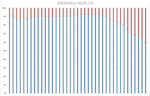 另一方面,美國上游石油公司獲得政府支持,美國原油出口禁令被解除,同時美國國內(nèi)管道瓶頸突破使得頁巖油運輸成本大降,美國原油出口大幅提升。由于美國頁巖油均為輕質(zhì)原油,而美國煉廠受制于裝置配套約束,難以再提升對輕質(zhì)原油的消費,頁巖油革命下美國國產(chǎn)原油的中、重質(zhì)原油比例不斷降低,美國輕質(zhì)原油結(jié)構(gòu)性過剩下頁巖油難以獲得較好銷售溢價。出口政策的突破和物流管道的建設(shè)讓頁巖油得以沖擊國際市場。下圖即為美國1980-2018年原油進(jìn)出口比例變化。
