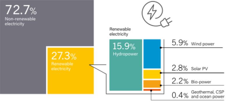2020年版REN21《全球再生能源現(xiàn)況報(bào)告》中的“全球電力生產(chǎn)的再生能源份額”。