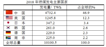 由于燃煤發(fā)電價廉,一直居高位,2011年占全球發(fā)電總量的9144/22126= 41.3%,到2018年回落速度緩慢,仍然保持在10100.5/26614.8= 38.0%。2018年最大的燃煤發(fā)電生產(chǎn)國是中國,占全球燃煤發(fā)電總量的46.9%;其次是美國,占總量的 12.3%,比往年逐步回落。