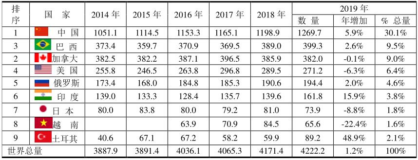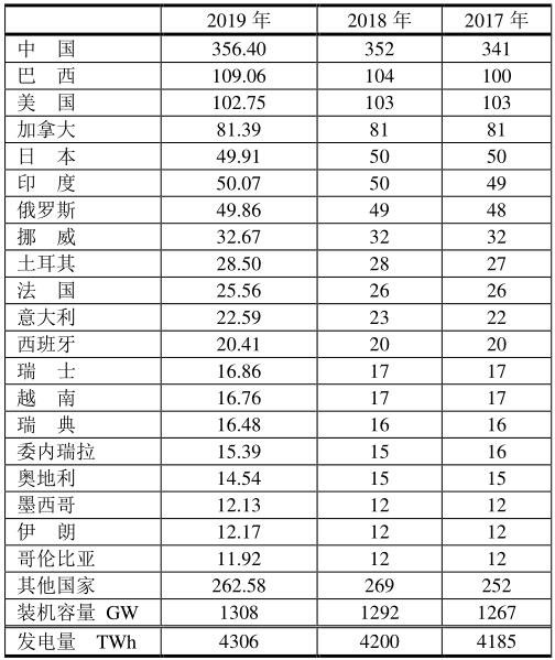 水力發(fā)電量最多的國(guó)家(單位:TWh)