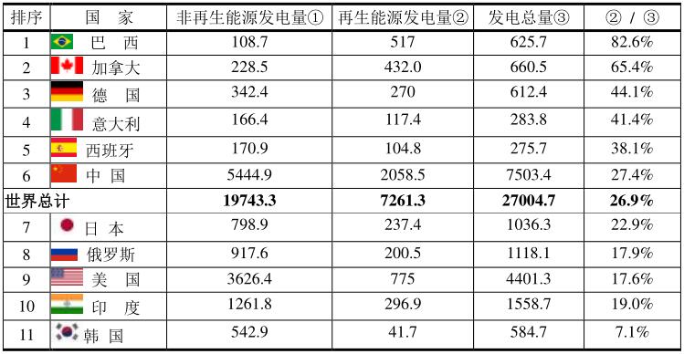 2019年主要國(guó)家再生能源發(fā)電的比例(單位:TWh)