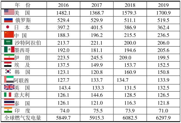 2016~2019年前14位燃?xì)獍l(fā)電最大的國(guó)家(單位:TWh)