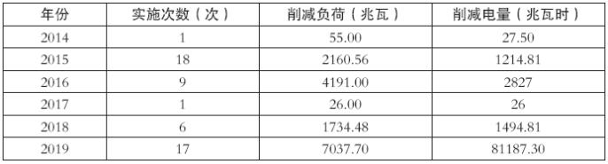 在需求響應(yīng)實(shí)施早期,實(shí)施目的主要是為了應(yīng)對夏季高峰時(shí)段電力消費(fèi)緊張狀況,最大程度削減高峰電力負(fù)荷對電網(wǎng)安全的影響,保障了民生用電和重點(diǎn)用電安全平穩(wěn)。2014~2019年度國內(nèi)開展削峰需求響應(yīng)的情況如下表所示。
