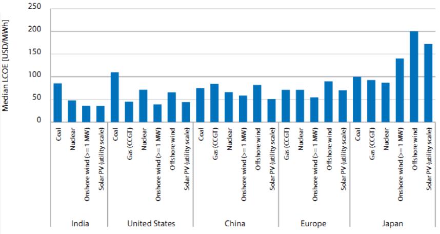 在中國和印度,風電和光伏等間歇性可再生能源的平均平準化發(fā)電成本最低,兩國的公用事業(yè)規(guī)模的太陽能光伏發(fā)電和陸上風電成本最低。核電也具有競爭力,這表明兩國都擁有從當前仍然高度碳密集的發(fā)電中轉(zhuǎn)型到低碳發(fā)電的基礎。